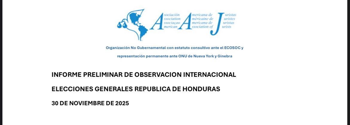 Compartimos el informe preliminar elaborado por la Misión de Observación Internacional de la Asociación Americana de Juristas, que fuera presentado al CNE en el día de la fecha, ya que consideramos constituye un aporte importante para la comprensión de las elecciones en la Republica de Honduras del pasado 30 de noviembre de 2025.